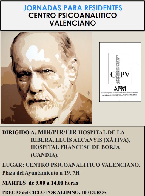 Jornadas para Residentes (MIR, PIR EIR) CPV-Introducción al Psicoanálisis II JORNADAS PARA RESIDENTES - CENTRO PSICOANALÍTICO VALENCIANO INTRODUCCIÓN AL PSICOANÁLISIS (II) OBJETIVO: Introducir en la práctica psicoanalítica a los residentes en salud mental. Familiarizarlos con una herramienta fundamental que permite profundizar en el funcionamiento psíquico relacionado con los procesos inconscientes y mejorar la relación terapéutica, aspectos esenciales en la práctica clínica. Esta segunda parte del curso se centra en el conocimiento y la aplicación de la técnica psicoanalítica a los pacientes de la institución pública. METODOLOGÍA: Sesiones teóricas y supervisión de casos procedentes de la práctica clínica de la institución, presentados por los alumnos. DIRIGIDO A: MIR - PIR- EIR // Hospital de la Ribera (Valencia), Hospital Lluís Alannyís (Xàtiva), Hospital Francesc de Borja (Gandía) LUGAR: Centro Psicoanalítico Valenciano. Plaza del Ayuntamiento, 19, 7H DIA Y HORA: Martes, de 09.00 a 14.00 h. PRECIO: 100 euros por alumno el ciclo completo INSCRIPCIONES E INFORMACIÓN: cpv@tecnobyte.com Programa:Martes, 3 de febrero (09.00-14.00 h.), Velencia. "Presentación. Técnica psicoanalítica": Carmen Ibáñez. "Supervisión paciente adulto": Gisela Renés.Martes, 10 de febrero (09.00-14.00) Valencia. "Entrevista y diagnóstico estructural" Carmen Ibáñez. "Supervisión paciente adulto" Fuensanta GuijarroMartes, 17 de febrero (09.00-14.00) Valencia. "Abordaje de niños y trabajo familiar" Soledad Jorge. "Supervisión de caso infantil" María VidalMartes, 24 de febrero (09.00-14.00) Valencia. "Valoración y psicoterapia adolescente" Sonsoles Puchades. "Supervisión de caso adolescente" Sonsoles PuchadesMartes, 3 de marzo (09.00-14.00) Valencia. "TFP Aplicación en la institución" Carmen Ibáñez. "Supervisión de un caso" Carmen Ibáñez